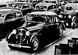 More significant was a series of inexpensive cars built 300 km (185 miles) to the south in Zwickau in the plant acquired by the company's owner Jørgen Skafte Rasmussen in 1928 when he had become the majority owner in Audi Werke AG.[8] Models F1 to F8 (F for Front) were built between 1931 and 1942, with successor models reappearing after the end of the war in 1945. They were the first volume production cars in Europe with front wheel drive, and were powered by transversely mounted two-cylinder two-stroke engines. Displacement was 584 or 692 cc: claimed maximum power was initially 15 PS, and from 1931 a choice between 18 or 20 hp (15 kW). These models had a generator that doubled as a starter, mounted directly on the crankshaft, known as a Dynastart.[9] DKW in Zwickau produced approximately 218,000 units between 1931 and 1942.[7] Most of those cars were sold on the home market and over 85% of DKWs produced in the 1930s were the little F series cars: DKW reached second place in German sales by 1934 and stayed there, accounting for 189,369 of the cars sold between 1931 and 1938, more than 16% of the market.[10]