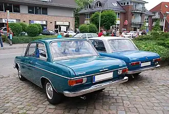 The F102 was initially available as a two-door sedan from March 1964 with four door cars joining them on the production line in January 1965.[4] While the design of its predecessor, the Auto Union 1000, essentially came from the late 1930s, the F102 was a newly designed vehicle with a unibody and - in keeping with contemporary taste - with large glass surfaces and little chrome. The new price of the two-door sedan was DM 7,200.[5]