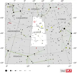 DK Lacertae (Nova Lacertae 1950) was a nova, which lit up in the constellation Lacerta in 1950. The nova was discovered by Charles Bertaud of the Paris Observatory on a photographic plate taken on 23 January 1950. At the time of its discovery, it had an apparent magnitude of 6.1.[6] DK Lacertae reached peak magnitude 5.0, making it easily visible to the naked eye.[2]