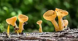 The Dacrymycetaceae are a family of fungi in the order Dacrymycetales. Species are saprotrophs and occur on dead wood. Their distribution is worldwide. Basidiocarps (fruit bodies) are ceraceous (waxy) to gelatinous, often yellow to orange, and variously clavarioid, disc-shaped, cushion-shaped, spathulate (spoon-shaped), or corticioid (effused).