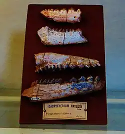 In 1891–1893, Karl Alfred von Zittel synonymized Mixtotherium and Plesidacrytherium with Diplobune, and Adrotherium (species A. depressum) with Dacrytherium. He supported the validity of D. cayluxense[a] and D. ovinum as well as the synonymy of "X. platyceps" with the latter species.[12] However, in 1892, Lydekker made reviews of the species of Dacrytherium. He contextualized that his 1885 reassignment of Dichobune ovina to Dacrytherium was based on the dental series of a cranium. At that time, he thought that D. cayluxense was one of two distinct species of Dacrytherium because he thought that the former differed from the latter based on dental differences including the canines. However, before Lydekker wrote his 1892 article, Arthur Smith Woodward presented him with more fossil evidence from the French phosphorites including a well-preserved mandible of D. cayluxi, leading him to synonymize it with D. ovinum. In addition, Lydekker considered his previous synonymy of X. platyceps with Dacrytherium "unfounded" since the former clearly lacked any lacrimal fossa that the latter has.[13]