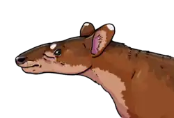 Dacrytherium has fairly complete skull material since 1876 and is best known for its large-sized lacrimal fossa in front of its eye, or "tear pit", hence the derivation of the genus name.[6][16][31] Such a depression as seen in Dacrytherium occurs in extant and extinct ruminants.[32] Dacrytherium is also known by the presence of a preorbital fossa, a feature where the preorbital gland is located in living animals; it is also present in some extant artiodactyls including bovids and deer. The preorbital fossae, which occupy the maxillae, were suggested by Nelly Delmont in 1941 to have no close analogues even amongst other mammals with preorbital fossae.[33] The infraorbital foramina are close to the orbits of the eyes and are connected to the preorbital fossa as a sac-like extension.[16] The deep preorbital fossa is present in all species except D. elegans, whose preorbital fossa is not as deep.[34][35]