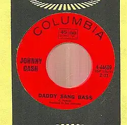 "Daddy Sang Bass" is a song written by Carl Perkins, with lines from the chorus of "Will the Circle Be Unbroken?" and recorded by American country music singer Johnny Cash. It was released in November 1968 as the first single from the album The Holy Land. The song was Cash's sixty-first release on the country chart, going on to No. 1 on the Billboard country chart for 6 weeks and spending a total of 19 weeks there.[3] The single reached No. 56 on the Cashbox pop singles chart in 1969.[4] "Daddy Sang Bass" was also released on the Columbia Records Hall of Fame Series as a 45, #13-33153, b/w "Folsom Prison Blues" (live version). The record was nominated in the CMA awards category of Single of the Year by the Country Music Association (CMA) in 1969.