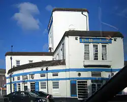 It is located in the triangular segment formed by the junction of Porters Avenue (the A1153) and Lodge Avenue, and is adjacent to a boating lake and Mayesbrook park, the home of Barking & East Ham United F.C.[1] The main circular building is approximately 50 feet (15 m) in diameter, but the function room, which was used for concerts and bingo, is a long, low ceilinged, rectangular wing, extending along Lodge Avenue. It lies roughly halfway between Upney and Becontree stations on the District line in zone 5. The Roundhouse is a stop on London Buses route 368.
