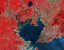 ![]() The Dagu River which flows into the Jiaozhou Bay is clearly visible in this satellite image of Qingdao | |