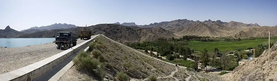 The Dahla Dam was built in 1952 on the Arghandab River, which flows over a length of 250 mi (400 km).[7] Over the decades its reservoir was subject to siltation, and its canal system reduced irrigation benefits. This necessitated undertaking rehabilitation of the dam which involved desiltation works and pertinent components of the project to improve the water delivery system; this component was completed during March 2012 with assistance provided by Canada. The second phase involved raising the height of the dam and the relevant dykes to compensate for the loss of storage in its reservoir due to siltation, and to achieve the full benefits of irrigation for which the dam was originally built.[8][9][10][11]