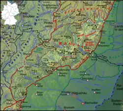 The Dahner Felsenland, also referred to as the Dahn Rockland,[1] is a landscape in the county of Südwestpfalz in the German federal state of Rhineland-Palatinate. It is located in the middle section of the Wasgau, which in turn forms the southern part of the Palatine Forest and the northern part of the Vosges in France. The Dahner Felsenland has numerous rock formations within the South Palatinate Climbing Area (Klettergebiet Südpfalz).