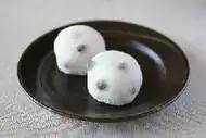 Daifukumochi (大福餅), or daifuku (大福) (literally "great luck"), is a wagashi, a type of Japanese confection, consisting of a small round mochi stuffed with a sweet filling, most commonly anko, a sweetened red bean paste made from azuki beans. Daifuku is often served with green tea.