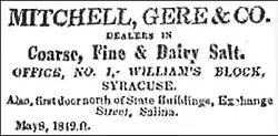 In the 1890s, many brands of dairy salt were available.[4] In England during this time, the Ashton and Higgins Eureka Salt brands were available (among others), and were used in the United States.[4] U.S. brands of dairy salt in the 1890s included Diamond Crystal Salt and Genesee Salt, among others.[4] Almost all of these brands were very pure, being 98–99% sodium chloride.[4]