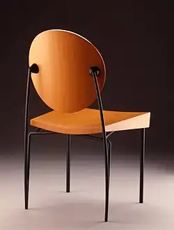 In 1991, Jackson introduced the "biomorphic" Vik-ter Stacking Chair[57] (commonly known as the Vik-ter Chair) at the third annual International Contemporary Furniture Fair at the Jacob K. Javits Convention Center in Manhattan.[58] The chair's "highly production oriented" design included a curving welded-steel frame and a tapered laminated cherry plywood seat that could be produced in seven minutes.[59]