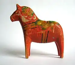 A Dala horse (Swedish: dalahäst) or Dalecarlian horse is a traditional carved, painted wooden statue of a horse originating in the Swedish province of Dalarna (Dalecarlia). The Dala horse has been widely used as a toy for children. It has also become a symbol of Dalarna, as well as of Sweden in general.