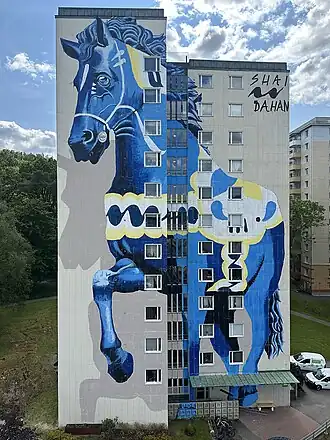 A similar Dala horse can be seen in Andersonville, Chicago, donated by the Swedish American Women's Educational Association (SWEA) to the Swedish American Museum. SWAE commissioned the Swedish Artist Lars Gillis to paint the Dala horse in a way that represents the connection between Sweden and Chicago. After eight years, the original Dala horse could not withstand the harsh Chicago weather conditions and was removed in 2013 for restoration that took a year.[6] It is now kept in the lobby of the Swedish American Museum, which provided a fiberglass replica placed on the corner of Clark and Farragut streets.[7][8]