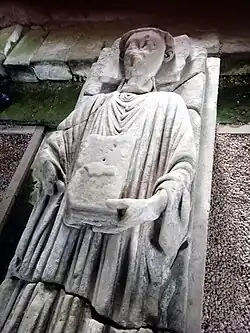 From the Premonstratensian point of view, Dale Abbey was founded in 1204 from Newsham Abbey in Lincolnshire.[2] However, the chronicle of the abbey, which dates from the mid-13th century,[3] gives a long and detailed prehistory. The author of the chronicle was Thomas de Muskham: the initial letters of the various sections of the foundation legend make up the name T. H. O. M. A. S. D. E. M. V. S. C. A.[4] Thomas did not trust in the detective work of later generations, but tells the reader explicitly that his name is in the capital letters of the text.[5]