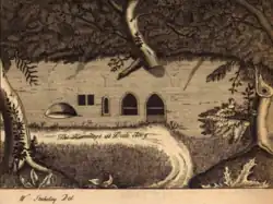 Muskham attributes the first part of the foundation legend to Matilda de Salicosa Mara of Lindsey, a local landowner whom he regarded as foundress of the community at Dale.[6] Muskham's chronicle places the origins of the abbey early in the previous century and credits the initiative to a local baker who experienced a vision of The Blessed Virgin Mary[7] telling him to go to Depedale.[8] The baker kept the religious experience secret but immediately set off eastward. Passing through the village of Stanley, he overheard a woman dispatching her daughter to Deepdale with a herd of calves. The former baker took this as a sign from God and asked the woman the way. He was told to follow the girl to Deepdale and so quickly arrived at his destination, described as locum palustrem valde terribilem longeque ab omni habitacione hominum separatum[9] — "a marshy place, extremely frightening, and far from human habitation." At the south east edge of the place he cut out a small rock house in the hillside and settled to an ascetic existence. A local landowner is named as Ralph Fitz Geremund, lord of a moiety of the manors of Ockbrook and Alvaston cum soc, i.e., holder of soke, the right and duty to constitute a court. He is portrayed by the chronicle as a Norman baron with interests on both sides of the Channel.[10] He was so impressed by the hermit and the wretchedness of his existence that he granted him a tithe of the proceeds of his own mill at Burgh (now thought to be at Alvaston, although earlier at Borrowash).[11] The remainder of the hermit's story is attributed to one Humfrid, a former canon. The hermit suffered spiritual torment in his later years, said by the chronicler to be the assaults of antiquus autem generis humani inimicus milleartifex[12] – "the ancient enemy of human kind, master of a thousand tricks," that is, Satan. To gain relief from these assaults, and from the lack of water at his hermitage, he searched for a new home.[13] By a spring in the little valley below he built a hut for himself and an oratory, dedicated to God and to the Blessed Mary, who seems to have been central to his spiritual life. There he lived in God's service until his death, which is described by the chronicler in almost Manichaean terms as release from the ergastulum, prison, of the body.[14]