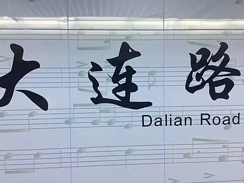 ![]() Name sign of Dalian Road on the Line 12 platform | ||||||||||||||||