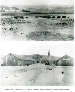 As a CCC camp, the facilities of Dalton Wells consisted of 18 buildings, most of which were 20 feet in length although some were as long as 100 feet.[8] The headquarters building was placed closest to the road leading to the camp, with facilities on the east side of the camp, and bunkers on the south. The buildings were made from wood and had tar paper roofs and windows.[4] Minimal repairs to the existing facilities from the CCC camp may have been completed before the arrival of the first group of internees from Manzanar. Historians dispute whether or not repairs were made, and whether a fence was erected around the facilities.[11][12]