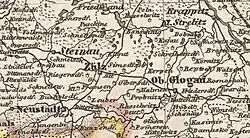 9. ^ Wieland, Johann Wolfgang (1736). Principatus Silesiae Oppoliensis exactissima Tabula geographica, sistens Circulus Oppoliensem Ober-Glogau Gros Strehliz, Cosel, Tost, Rosenberg, Falckenberg & Lubleniz. Norimbergae: ab Homannianis Heredibus. Cum Spec. S. Caes. Rque Mtis Privilegio.