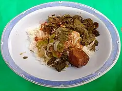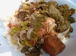 Dambu or dambou is a dish native to the Zarma and Songhai of Southwestern Niger made from cereals and moringa. It is consumed at any time but mainly during festive occasions such as outdoorings and weddings. This dish is also common among the Dendi people of North Benin and other West African cities. It is also common in the Zongo settlements where the Songhai and Zarma travel.[1]