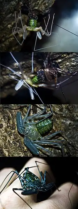 Damon diadema is a species of amblypygid, sometimes known as the tailless whip scorpion or giant amblypygid.[1] It is found in Central Africa, Kenya, and Tanzania where it lives in caves, crevices and under fallen logs.[1] The animal is 4–28 mm (0.16–1.10 in) long with a flat body.[1] It is known as a tailless whipscorpion because of the long whip-legs that are the majority of its body width. Its legspan is about 20 cm (7.9 in).