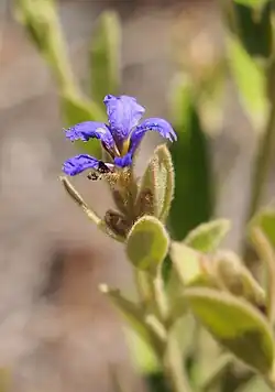 Dampiera ferruginea commonly known as velvet beauty-bush,[2] is a flowering plant in the family Goodeniaceae and is endemic to Queensland. It is a small, upright shrub with blue flowers.