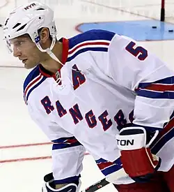 Girardi and the Rangers began the 2008–09 season with a winning 7–2–1 record.[32] By mid-November, Girardi was tied for fifth in points and third in assists among all NHL defencemen.[33] However, the Rangers struggled as the season continued and they fell out of a playoff position with 21 games left in the season. As such, head coach Tom Renney was replaced with John Tortorella in February 2009.[34] Under Tortorella, Girardi shifted away being used in a more offensive role to being used in more "defense-minded" situations.[35] With this method, the Rangers qualified for the 2009 Stanley Cup playoffs[36] and Girardi finished the regular season with four goals and 18 assists.[1] While Girardi and his defensive partner Marc Staal struggled in the playoffs, Tortorella reiterated his confidence in them and described the duo as "the foundation of our back end in the future."[37]