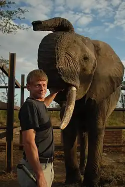 ![]() Dan Koehl and African savanna elephant bull "Bonniface" at Elephant Experience, Victoria Falls, Zimbabwe (2005) | |