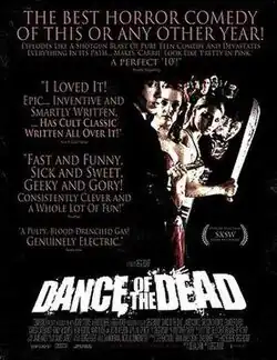 Jason Whyte of eFilmCritic.com called it a "triumph in nearly every way; not only is an independent film that takes its small budget and runs with it, it is everything you want out of a horror comedy and more."[21] Scott Weinberg of FEARnet was surprised that "character development" was possible, and called it "fast and funny, sick and sweet, nerdy and gory. Basically, a whole lot of fun."[22] Expecting a "cheesy zombie flick", reviewer Brian Gibson instead described it as a "zombie/prom weekend film that ended up being one of the best surprises of the [film] festival."[23] Anton Bitel, who writes for UK film magazine Little White Lies, was tired of the zombie comedy genre in general yet still saw a film distinguished by "sharp writing, amusing characters, and a real affection for nerd culture."[24] Collin Armstrong of Twitch Film wrote, "Owing a sizable debt to Dan O'Bannon's classic punk gut-muncher Return of the Living Dead, Dance manages to offer a few new ideas while mostly just taking those we've seen time and again to gonzo levels of execution."[25] Steve Barton of Dread Central rated it five out of five stars and wrote that the film "is rife with everything we could want in a living dead flick — great characters, good-looking zombies, and tons of gore!"[26] Tim Anderson of Bloody Disgusting rated it five out of five stars and called it "the best horror comedy of this or any other year".[27] David Harley, also writing at Bloody Disgusting, rated it four-and-a-half stars out of five and wrote, "Out of all the films I’ve seen at SXSW this year, regardless of genre, Dance of the Dead stands out as the most impressive and entertaining."[28]