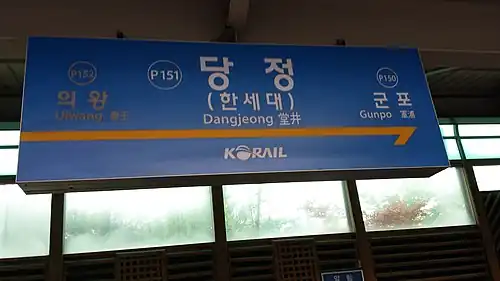 Dangjeong station (Korean: 당정역) is an infill station on the Seoul Metropolitan Subway Line 1. It serves the city of Gunpo in Gyeonggi Province, South Korea and is the subway station closest to Hansei University.