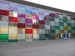 In 1986, when François Mitterrand was president of France, Buren attained leading artist status after he created Les Deux Plateaux (1985–86), a work in situ for the Cour d'honneur at the Palais Royal in Paris. That same year, he represented France at the Venice Biennale and won the Golden Lion Award for best pavilion. Buren had major solo exhibitions at the Touko Museum of Contemporary Art, Tokyo, in 1989, at the Centre Georges Pompidou in Paris in 2002,[24] at the Guggenheim Museum in New York in 2005, at Modern Art Oxford in 2006, and at the Kunsthalle Baden-Baden in 2011. In December 2006 Buren won the competition to make Arcos Rojos/Arku Gorriaka, a new major project for the iconic Puente de La Salve bridge next to the Guggenheim Museum in Bilbao while, in February 2007, the Musée Fabre in Montpellier re-opened with a new permanent commission. For the 52nd Venice Biennale, Buren created a new site-specific work for the Giardini of the Italian Pavilion, and was curator of Sophie Calle's contribution to the French Pavilion.[25] In 2011, he decided to cancel an exhibition at the Ullens Center for Contemporary Art in Beijing in "solidarity" with detained artist Ai Weiwei.[26] The fifth artist ever to fill the space of the Grand Palais on the occasion of the Monumenta exhibition, Buren conceived Excentrique(s) in 2012, a giant cluster of colored, transparent plastic discs, which overlap to form a colourful canopy.[27]