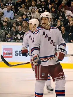 Girardi and the Rangers began the 2008–09 season with a winning 7–2–1 record.[32] By mid-November, Girardi was tied for fifth in points and third in assists among all NHL defencemen.[33] However, the Rangers struggled as the season continued and they fell out of a playoff position with 21 games left in the season. As such, head coach Tom Renney was replaced with John Tortorella in February 2009.[34] Under Tortorella, Girardi shifted away being used in a more offensive role to being used in more "defense-minded" situations.[35] With this method, the Rangers qualified for the 2009 Stanley Cup playoffs[36] and Girardi finished the regular season with four goals and 18 assists.[1] While Girardi and his defensive partner Marc Staal struggled in the playoffs, Tortorella reiterated his confidence in them and described the duo as "the foundation of our back end in the future."[37]