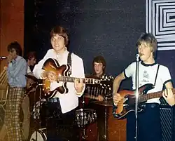 For the rest of 1963, the group played skiffle, but by Christmas of that year, the group decided to follow in the footsteps of Beatlemania and become a beat group instead.[6] After recruiting drummer Freddie Skantze, Larsson signed a contract for an electric guitar, which would become his primary instrument for the remainder of his career in the group.[7][8] Unlike many other Swedish groups, who had one lead singer, the members of Tages were each was allowed at least one lead vocal per show, often harmonizing.[9] This included Larsson, who often would get lead vocals during primarily rhythm and blues numbers.[8][10] Larsson, together with the band, achieved nationwide fame after winning a contest in Liseburg called Västkustens Beatles, in which Larsson sang harmony parts and generally played a larger part in.[11][12]