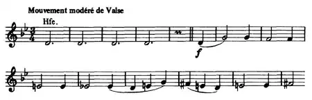 The first theme is heard on a solo flute,[2] followed by the second theme, a descending scale on the solo violin which is accompanied by soft chords from the string section.[3] The first and second themes, or fragments of them, are then heard throughout the various sections of the orchestra. The piece becomes more energetic and at its midpoint, right after a contrapuntal section based on the second theme,[4] there is a direct quote[5] played by the woodwinds of Dies irae, a Gregorian chant from the Requiem that is melodically related to the work's second theme. The Dies irae is presented unusually in a major key. After this section the piece returns to the first and second themes and climaxes with the full orchestra playing very strong dynamics. Then there is an abrupt break in the texture[6] and the coda represents the dawn breaking (a cockerel's crow, played by the oboe) and the skeletons returning to their graves.