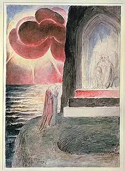 The gate of Purgatory, Peter's Gate, is guarded by an angel bearing a naked sword, his countenance too bright for Dante's sight to sustain. In reply to the angel's challenge, Virgil declares that a lady by the name of Lucia brought them there and directed them to the gate. On Virgil's advice, Dante mounts the steps and pleads humbly for admission by the angel, who uses the point of his sword to draw the letter "P" (signifying peccatum, sin) seven times on Dante's forehead, bidding him "take heed that thou wash / These wounds, when thou shalt be within."[28] With the passage of each terrace and the corresponding purgation of his soul that the pilgrim receives, one of the "P"s will be erased by the angel granting passage to the next terrace. The angel at Peter's Gate uses two keys, silver (remorse) and gold (reconciliation), to open the gate – both are necessary for redemption and salvation.[26] As the poets are about to enter, they are warned not to look back.