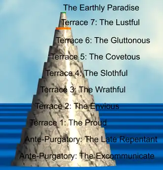 After passing through the gate of Purgatory proper, Virgil guides the pilgrim Dante through the mountain's seven terraces. These correspond to the seven deadly sins or "seven roots of sinfulness":[29] Pride, Envy, Wrath, Sloth, Avarice (and Prodigality), Gluttony, and Lust. The classification of sin here is more psychological than that of the Inferno, being based on motives rather than actions.[30] It is also drawn primarily from Christian theology, rather than from classical sources.[31] The core of the classification is based on love: the first three terraces of Purgatory relate to perverted love directed towards actual harm of others, the fourth terrace relates to deficient love (i.e. sloth or acedia), and the last three terraces relate to excessive or disordered love of good things.[29] Each terrace purges a particular sin in an appropriate manner. Those in Purgatory can leave their circle voluntarily, but may only do so when they have corrected the flaw within themselves that led to committing that sin.