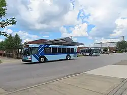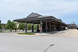 The Richard L. Brazda Bus Terminal, located downtown at 101 N. Hazel St., serves as the primary transfer hub for Danville Mass Transit. Opening in 2017 and costing $3 million, the facility includes indoor seating, restrooms, and vending machines.[7] In addition to serving Danville Mass Transit, the facility also serves intercity buses.[8][9] Greyhound Lines service to the facility began in January 2019 with one round trip and stops at Champaign’s Illinois Terminal, Bloomington-Normal, Oglesby, Rochelle, Elgin, Rockford and Chicago.[10]