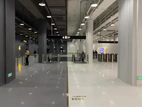 Danyang Road Station has a color design that is divided into two parts. The west side of the station is dark, while the east side of the station is a bright, representing the past and present of Yangpu riverside respectively. This contrast makes the station a popular photographic subject.[4][5]