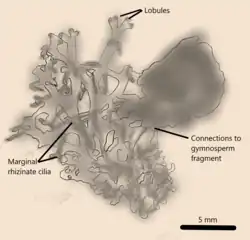 The photobiont component of the D. ciliiferus specimens is comparable to extant green algae species. These cells are globose with a diameter of between 1.5 and 2.5 μm. The mycobiont-photobiont attachment is via wall-to-wall interface, allowing nutrient exchange between the fungal and algal components.[6] The fungal hyphae of the mycobiont component are filamentous and septate with a diameter of less than 1.25 μm. Both the photobiont cells and fungal hyphae are narrower than those of extant macrolichen species which could be due to drying during the fossilisation process which caused shrinkage. Alternatively, the photobiont algae species could have been naturally smaller in size in this lichen species.[2] No alternative explanation has been proposed as to why the fungal hyphae are smaller than those in comparable extant macrolichens.