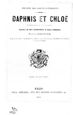 Daphnis et Chloé is a one-act opérette by Jacques Offenbach. The libretto was by Clairville (alias of Louis-François Nicolaïe, 1811–1879) and Jules Cordier (alias of Éléonore Tenaille de Vaulabelle, 1801–1859), based on the story of Daphnis and Chloe. The origin is the novel by Longus adapted as a play at the Théâtre du Vaudeville in 1849.[1]