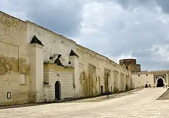 The Dar al-Makina (an Arabic adaptation of the word "machine") was established by Sultan Moulay Hassan in 1885–86 with the help of Italian officers.[1][2] The northern gate of the New Mechouar, known as Bab Khibbat es-Smen ("Gate of the Butter Niche"), also dates from the 1886 construction of Moulay Hassan.[1] The arms factory was an early attempt at industrialization in Fez and was part of the sultan's efforts to modernize the Moroccan army to compete with European powers, though they did not have enormous effect.[2]: 353–355 [3] The factory is no longer in use and stands abandoned and partially ruined. The structure is scheduled to be restored between 2018 and 2023 as part of a broader plan to restore over a hundred historic monuments in Fez.[4]