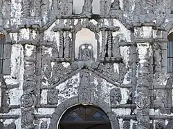 It is one of the few churches in the country that has four spiral columns known as Solomonic columns or salomónicas.[4] The four columns bear round medallions, each with carved images of the four Evangelists.[4][13] Another characteristic of the façade, which is unique to the church, is the absence of either vertical columns or horizontal cornices.[13] Engraved on the façade and the adjacent belfry are statues of saints, mostly Franciscans, and rare religious seals such as the coats of arms of the Franciscan order, the Pope's tiara with the keys, and the five wounds or stigmata of St. Francis which survived the Second World War.[3][14][15]