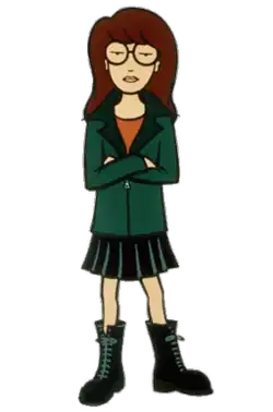 In the series Daria, which followed Beavis and Butt-Head, Daria remains bespectacled and plain. She is an unfashionably dressed, highly intellectual, entirely pessimistic about life altogether, cynical, and sarcastic teenage girl who is portrayed as an icon of sanity in an insane household in an equally insane upper middle class suburb. She resides with her vacuous, fashion-obsessed younger sister Quinn and career-obsessed parents Helen and Jake. Their family name, "Morgendorffer" (lit. "one from Dawn Village", Morgen + Dorf + -er), indicates that her father's family originally hails from Germanic roots. John Allemang of The Globe and Mail said that Daria is "both the disappointment of her overachieving parents and an embarrassment to her boy-crazy sister Quinn".[8] She had moved to a new school, having transferred from the one in Beavis and Butt-Head. Glenn Eichler said, in relation to Daria the series, of which he was a co-creator, "I like to think that I've helped her come out of her shell."[13]