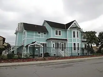 The house, made of redwood, has a gable roof, in which the front and side bay gables are decorated with scrolls. The exterior has not been altered much from its original state, but only one stained glass window remains, on the front door. A water tower built in 1878, originally for an earlier house, is attached to the side, containing its original pipes. The stairs found at the side of the building the tower is housed in were added in 1930.[1][2] The house cost $2,800 to build.[3]