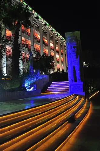 Dariush Grand Hotel's architecture is inspired by Persepolis, a symbol of the ancient Persian architecture and the Achaemenid Empire of Iran. The hotel was developed by Iranian entrepreneur Hossein Sabet, who also owns and manages several tourist attractions and hotels in the Canary Islands and was designed and Built by [MCI Group Development_Canadian Company] owned by [Rez Okhowat]. The hotel was completed in 2003 and is owned by a number of companies.[1]