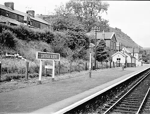 Darran and Deri railway station was situated on the Brecon and Merthyr Junction Railway, serving the adjoining village of Deri and the nearby Darran Colliery. It was located at 20 miles 08 chains from Newport. The line was built and owned partly by the Rhymney Railway and partly by the Brecon and Merthyr Railway, the boundary between the two companies lying a short distance north of Darran and Deri. The line passed to the Great Western Railway in 1923 and to British Railways (Western Region) in 1948.[1]