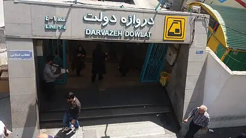 Darvazeh Dowlat Metro Station is the junction of Tehran Metro Line 1 and Tehran Metro Line 4. It is located in the junction of Enghelab Street, Saadi Street and Dr. Mofatteh Street.[1][2] It is between Panzdah-e-Khordad Metro Station and Saadi Metro Station in Line 1 and Mellat Metro Station and Hasan Abad Metro Station. This station is a crowded station because it has connections to Tarbiat Modares University, Ferdowsi Shoe Bazar, Enghelab Book Bazar and Tehran Bus BRT1.
