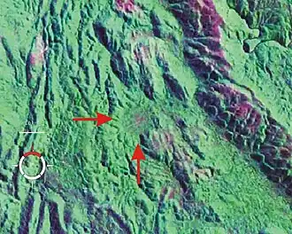 Oblique false-colour Landsat image of Darwin Crater (arrowed) draped over digital elevation model; screen capture from NASA World Wind -