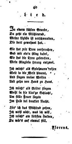 "Das zerbrochene Ringlein" (The broken little ring) is a poem by Joseph von Eichendorff, published under the title "Lied" (lay, or song) in 1813 by Justinus Kerner et al. in the almanac Deutscher Dichterwald (German Poets' Forest) under the pseudonym "Florens".[1] The poem appears under Eichendorff's name in his first novel Ahnung und Gegenwart, written in 1812 and published in 1815.[2] It is also known by its first line, "In einem kühlen Grunde" (In a cool valley).