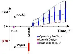60. ^ Contrast real option valuation with the much lower valuation of an NPV calculation which results from summing all operating profits and launch costs, including negative outcomes, to derive a one-time average value.