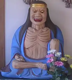 During the Kaei era (1848-1854), Datsueba took on a drastically different presentation through a statue of her at the Shōjuin temple in the city of Edo. This statue garnered widespread popularity due to the belief that it retained the power to grant wishes and worldly benefits to worshippers who visited the statue.[1] This statue's likeness was depicted in the form of nishiki-e woodblock print responding to the sudden craze around the Shōjuin Detsueba, but the artist Utagawa Kuniyoshi (1798– 1861) chose to portray her in a manner that greatly differed from that of traditional Buddhist visual depictions.[1] Rather, Utagawa Kuniyoshi depicted Detsueba as blue skinned and clothed in a yellow robe. This new visual portrayal reflected the belief behind the Shōjuin Datsueba as a granter of wishes rather than a frightening hag in hell who is responsible for sinful spirits.