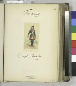 {{cite book}}: CS1 maint: multiple names: authors list (link) - Lienhart, Dr. Leo; Humbert, René (1899). Les Uniformes de l'Armée Français: Recuil d'ordonnances de 1690 à 1894. Vol. II: Cavalerie. Leipzig, Kingdom of Saxony, German Empire: M. Ruhl Library.